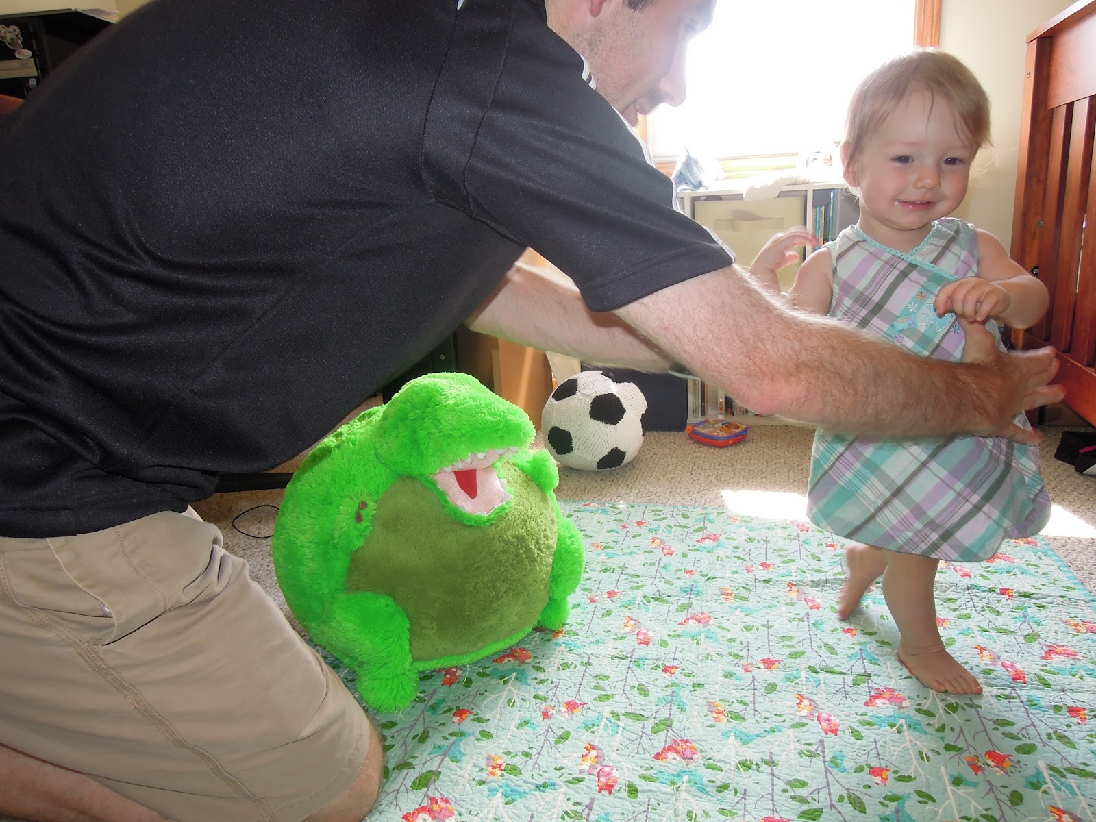 She is teething again - which brings her total tooth count up to 11, I think. I have been so bad about recording when exactly each tooth has come in. She was extra crabby with this tooth. I can't blame her, but I hope she has a little break before the next one starts coming in. She is learning to use her teeth, though - she'll take bites off of pieces of bread or bananas. I am starting to give her bigger pieces of food because she wants her food to look just like Mom and Dad's. None of this cut up into small pieces business thank you very much.
